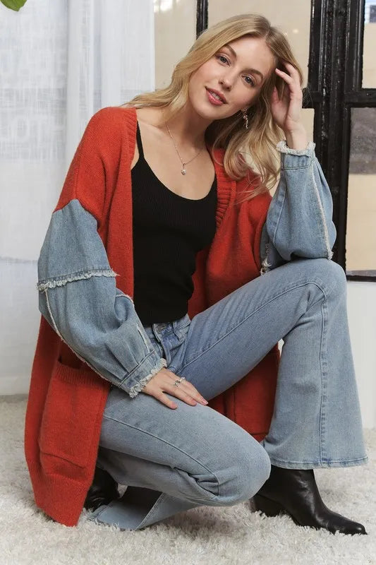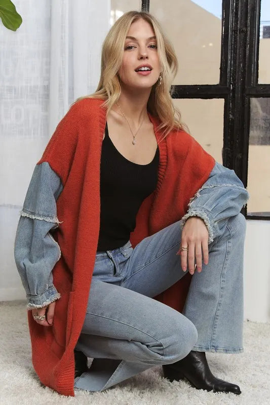 This sweater cardigan features unique frayed denim sleeves for a trendy and edgy look. The denim sleeves add a stylish and casual touch to the classic sweater cardigan silhouette. The frayed detailing gives the cardigan a cool and rugged aesthetic. Made with soft and cozy fabric, this cardigan offers both comfort and style for everyday wear. Elevate your wardrobe with this fashionable and versatile piece that effortlessly combines denim and knitwear for a chic and contemporary outfit.