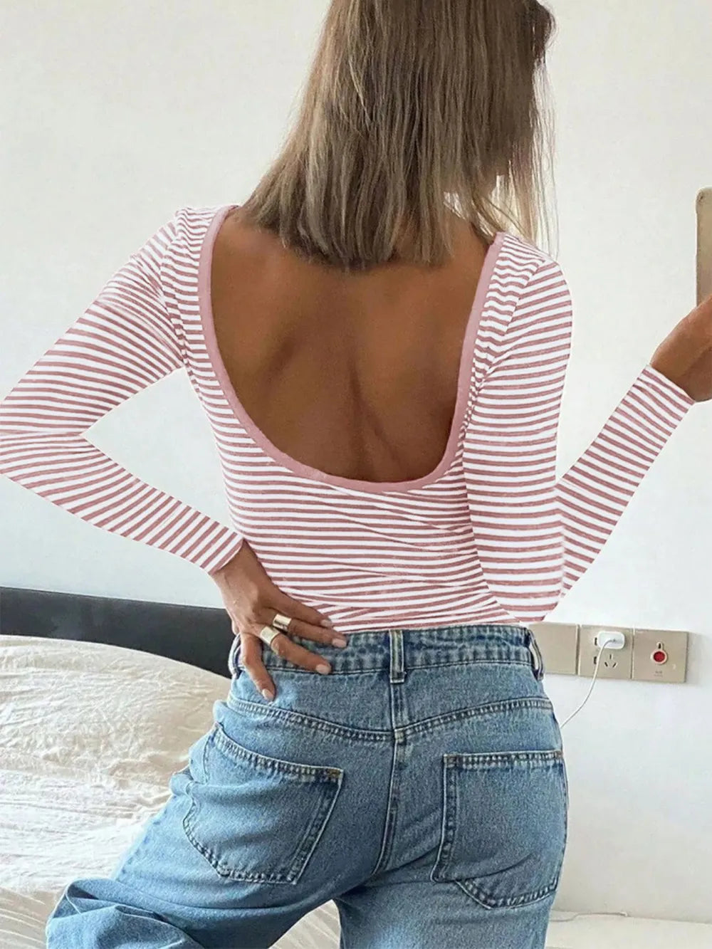 Devine Backless Striped Boat Neck Long Sleeve T-Shirt