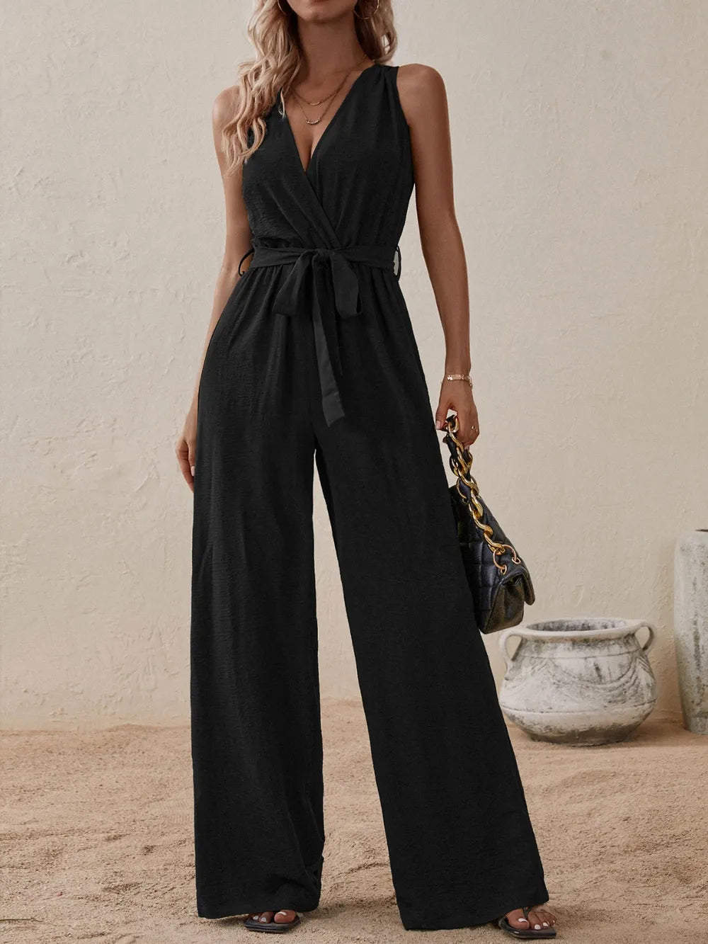 Honey Tied Surplice Sleeveless Wide Leg Jumpsuit