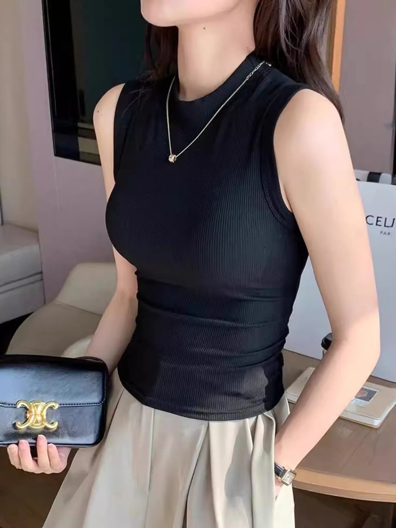 Ribbed Mock Neck Sleeveless Tank Top