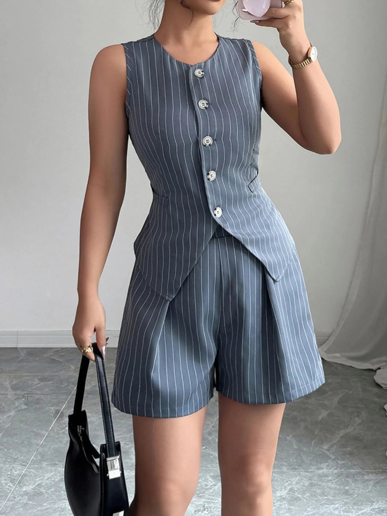 Striped Button Up Vest and Shorts Set